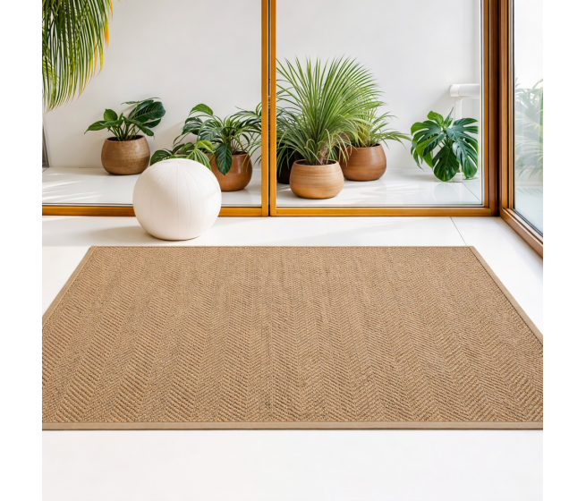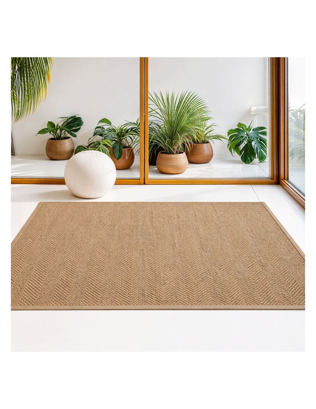 Le tapis Botanic Chevron revisite l’esprit des fibres naturelles avec un motif en chevron élégant et structurant. Son tissage à plat en 100% polypropylène reproduit avec réalisme l’aspect du sisal et du jonc de mer, tout en apportant une dimension graphique subtile qui dynamise l’espace. Son motif en chevron, à la fois discret et rythmé, crée du relief visuel et apporte du caractère à votre intérieur, sans alourdir la décoration. Il s’intègre aussi bien dans des ambiances contemporaines que dans des univers plus naturels ou bord de mer. Conçu pour un usage quotidien, il offre une excellente résistance et une grande facilité d’entretien. Son dossier en feutre assure un bon maintien au sol et un confort appréciable. Avec une hauteur totale de 7,5 mm, il présente une belle densité tout en restant agréable sous le pied. Adapté à un usage intérieur comme extérieur couvert, le tapis Botanic Chevron est certifié Oeko-Tex Standard 100 et classé A+ pour les émissions dans l’air intérieur, garantissant qualité et sécurité. Confectionné sur mesure en France, il est proposé avec une finition gansée ou galonnée, en format carré, rectangle ou rond, pour s’adapter parfaitement à votre projet — de 0,6 x 1,4 m jusqu’à 4 x 6 m.